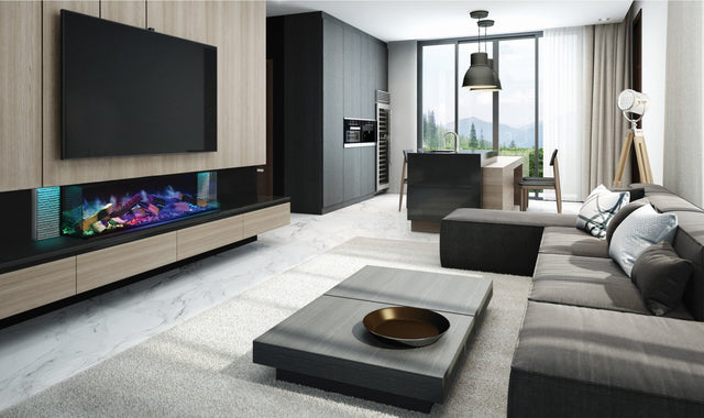 Voici le nouveau foyer électrique de la série Club Element4 . Il offre des flammes impressionnantes et magnifiques, un chauffage intégré et un éclairage au sol élégant, le tout combiné au confort du chauffage électrique. Des panneaux infrarouges sont également disponibles en option pour chauffer le reste de la maison. De plus, le foyer est doté d'un verre antireflet offrant une vue imprenable sur les flammes.