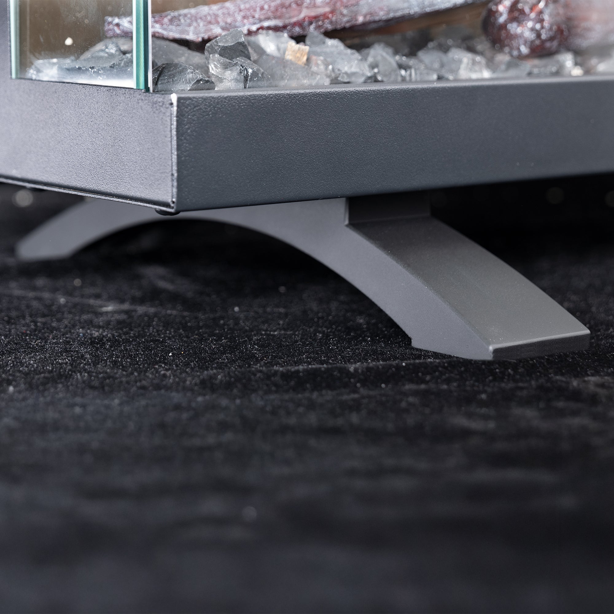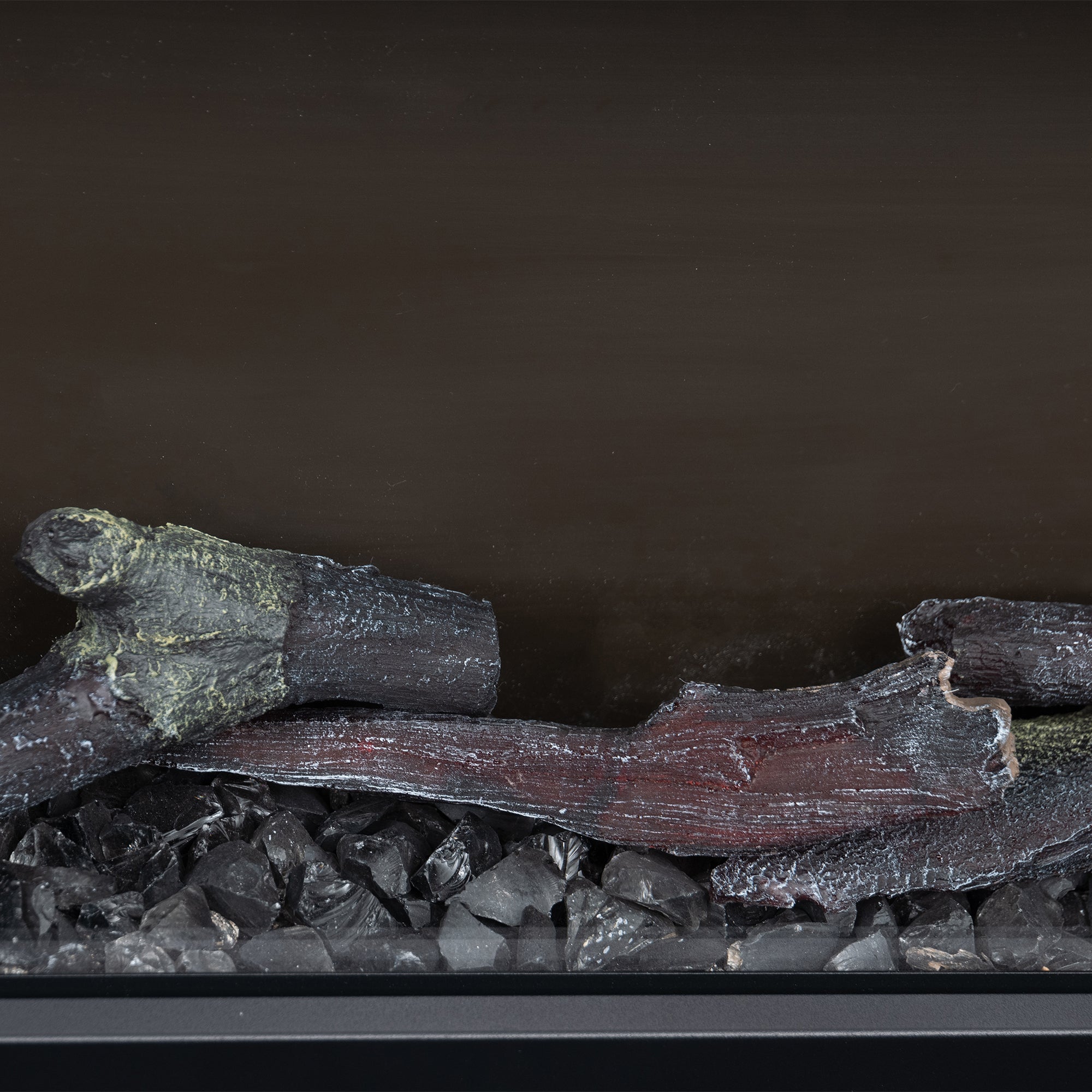 De combinatie van oranje en zwarte crushed glass, de white plastic tray en de luxe driftwood houtset geeft de haard een diepe en realistische gloed.