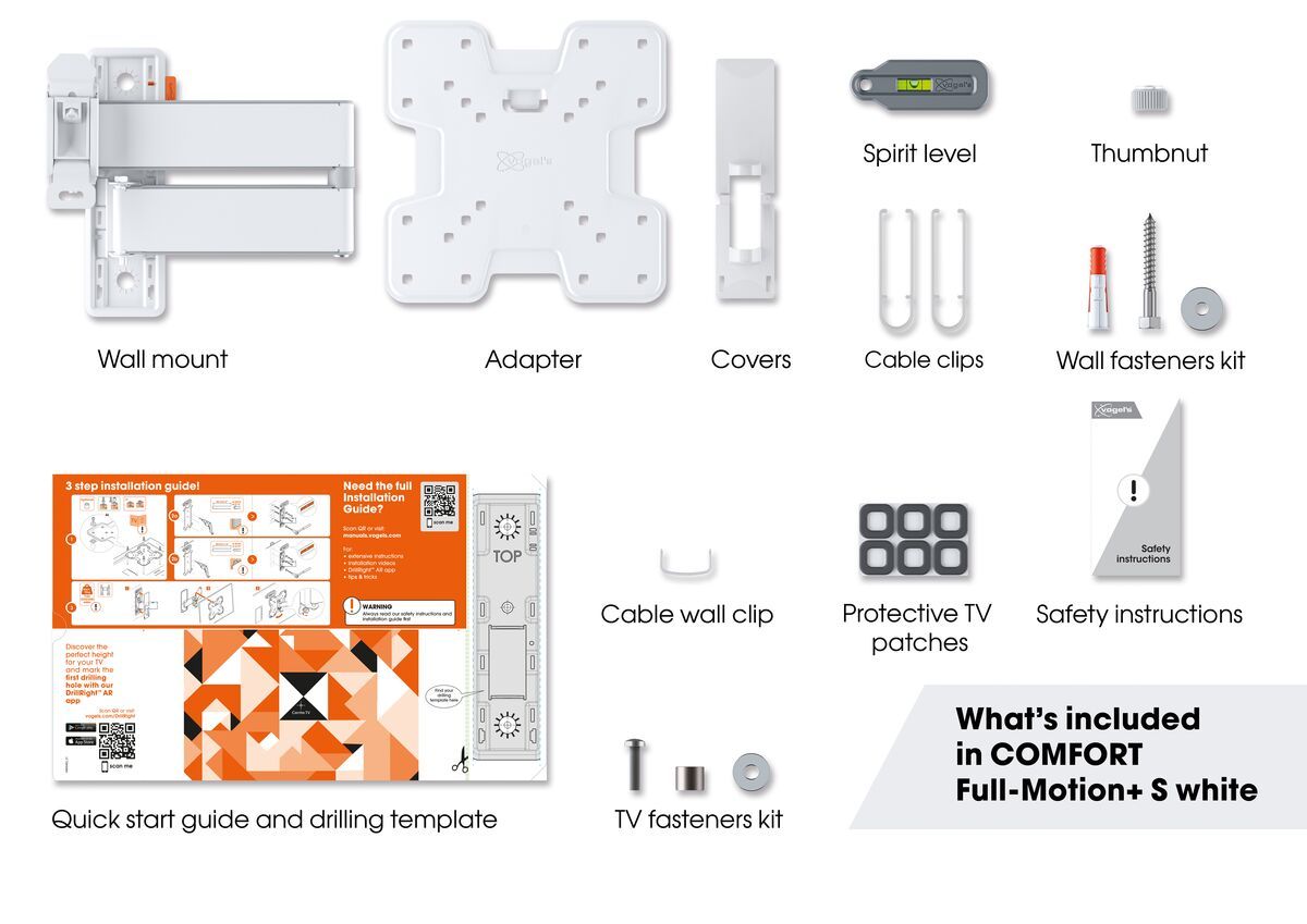 De Vogel's Comfort 3245 is een flexibele beugel waarmee je veilig een kleinere televisie ophangt. Deze beugel is geschikt voor schermen met een inchformaat tussen 19 inch en 43 inch. Dankzij het draai- en kantelbare ontwerp bekijk je vanuit iedere plek in de kamer de optimale beeldkwaliteit. De beugel heeft op 3 plekken een draaimogelijkheid. Zo draai je het scherm naar je kijkpositie en bepaal je zelf hoe dicht het scherm tegen de muur hangt. Hangt je televisie niet op ooghoogte? Dan kantel je gemakkelijk het scherm naar boven of beneden, tot een maximale hoek van 10 graden. Je werkt kabels eenvoudig weg met de meegeleverde kabelclips. Gebruik Vogel's DrillRight app om tijdens de installatie precies te zien hoe en waar je de beugel ophangt. Met de meegeleverde waterpas en de boormal weet je zeker dat de beugel kaarsrecht hangt.
