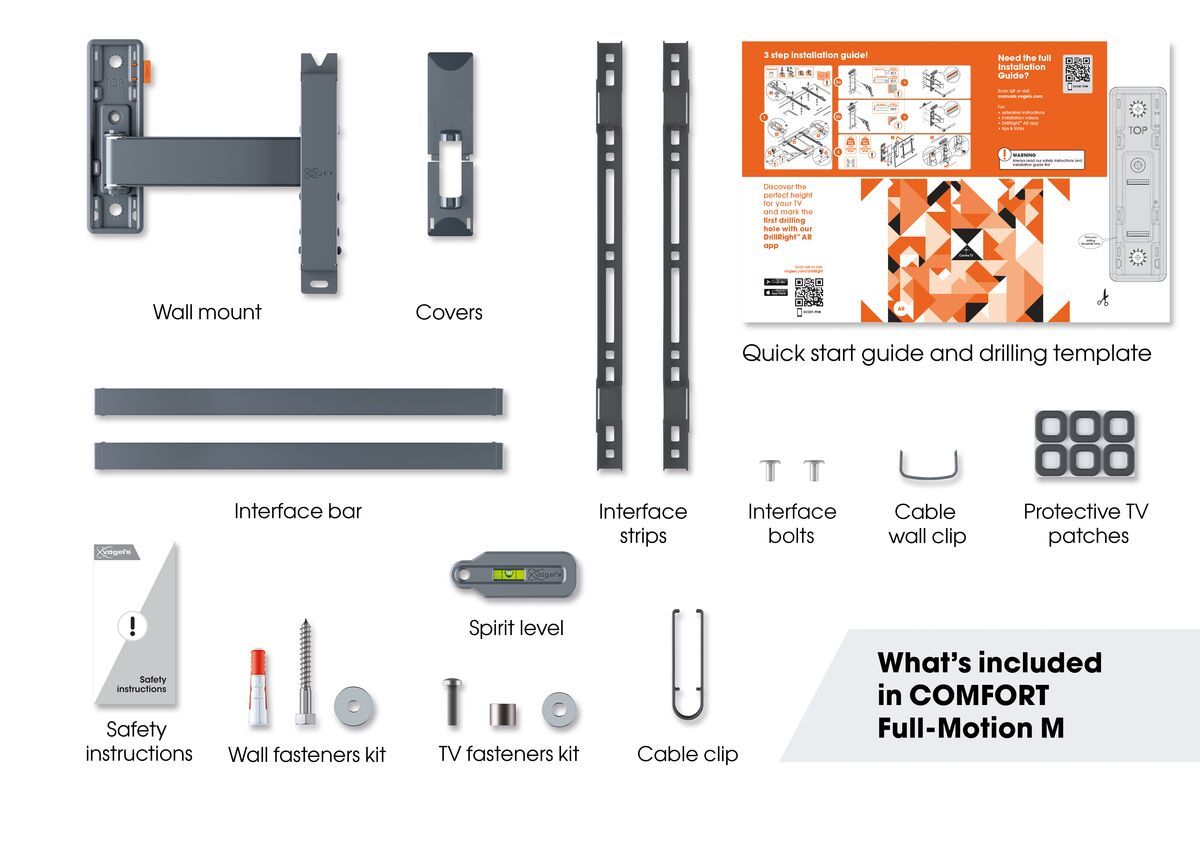 Met de Vogel's Comfort 3425 richt je een middelgrote tot grote tv gemakkelijk naar diverse posities. Je draait de tv eenvoudig van je bank naar de eettafel. Als je de tv hoog aan de muur wilt hangen, kantel je de beugel tot 20 graden naar beneden. Op deze manier is het scherm duidelijk zichtbaar en heb je minder last van storende reflecties op het scherm. Dankzij de level functie pas je met een knop aan de achterkant van de beugel de positie van de tv na installatie aan, zodat het scherm helemaal recht hangt. Heb je hulp nodig bij de installatie, download dan de Vogel's DrillRight app op je smartphone of tablet. Deze app gebruikt de meegeleverde poster als herkenningspunt, zodat je precies ziet waar het eerste boorgat moet komen. De Comfort 3425 is geschikt voor tv's van 32 tot en met 65 inch en heeft een maximaal draaggewicht van 25 kilogram.